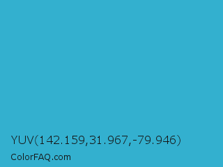 YUV 142.159,31.967,-79.946 Color is a normal cyan color and the nearest color is Scooter #2ebfd4. Hex code #33b0cf and RGB value is rgb(51,176,207). In RGB color space, this color is composed of 20% red, 69% green, 81% blue, In CMYK color space, this color is composed of 75% cyan, 15% magenta, 0% yellow , 19% black , In HSL color space, this color has a hue angle of 192° , 62% saturation and 51% lightness.