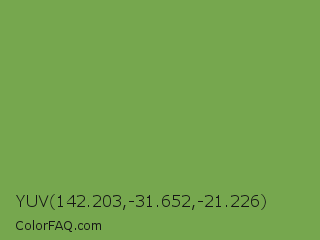YUV 142.203,-31.652,-21.226 Color is a normal green color and the nearest color is Asparagus Green #7ba05b. Hex code #76a74e and RGB value is rgb(118,167,78). In RGB color space, this color is composed of 46% red, 65% green, 31% blue, In CMYK color space, this color is composed of 29% cyan, 0% magenta, 53% yellow , 35% black , In HSL color space, this color has a hue angle of 93° , 36% saturation and 48% lightness.