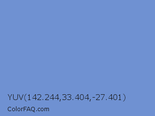 YUV 142.244,33.404,-27.401 Color is a light blue color and the nearest color is Blue Gray #6699cc. Hex code #6f91d2 and RGB value is rgb(111,145,210). In RGB color space, this color is composed of 44% red, 57% green, 82% blue, In CMYK color space, this color is composed of 47% cyan, 31% magenta, 0% yellow , 18% black , In HSL color space, this color has a hue angle of 219° , 52% saturation and 63% lightness.