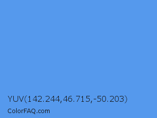 YUV 142.244,46.715,-50.203 Color is a light blue color and the nearest color is United Nations Blue #5b92e5. Hex code #5599ed and RGB value is rgb(85,153,237). In RGB color space, this color is composed of 33% red, 60% green, 93% blue, In CMYK color space, this color is composed of 64% cyan, 35% magenta, 0% yellow , 7% black , In HSL color space, this color has a hue angle of 213° , 81% saturation and 63% lightness.