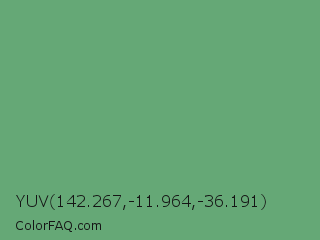 YUV 142.267,-11.964,-36.191 Color is a normal green color and the nearest color is Aqua Forest #5fa777. Hex code #65a876 and RGB value is rgb(101,168,118). In RGB color space, this color is composed of 40% red, 66% green, 46% blue, In CMYK color space, this color is composed of 40% cyan, 0% magenta, 30% yellow , 34% black , In HSL color space, this color has a hue angle of 135° , 28% saturation and 53% lightness.
