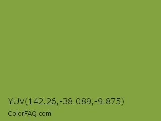 YUV 142.26,-38.089,-9.875 Color is a normal green color and the nearest color is Sushi #87ab39. Hex code #83a341 and RGB value is rgb(131,163,65). In RGB color space, this color is composed of 51% red, 64% green, 25% blue, In CMYK color space, this color is composed of 20% cyan, 0% magenta, 60% yellow , 36% black , In HSL color space, this color has a hue angle of 80° , 43% saturation and 45% lightness.