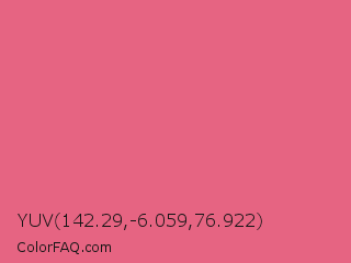 YUV 142.29,-6.059,76.922 Color is a light red color and the nearest color is Blush #de5d83. Hex code #e66482 and RGB value is rgb(230,100,130). In RGB color space, this color is composed of 90% red, 39% green, 51% blue, In CMYK color space, this color is composed of 0% cyan, 57% magenta, 43% yellow , 10% black , In HSL color space, this color has a hue angle of 346° , 72% saturation and 65% lightness.