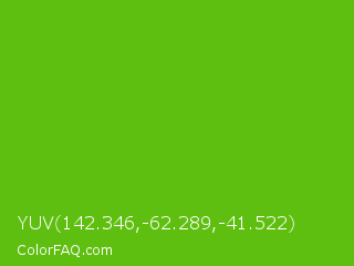 YUV 142.346,-62.289,-41.522 Color is a normal green color and the nearest color is Kelly Green #4cbb17. Hex code #5fbf10 and RGB value is rgb(95,191,16). In RGB color space, this color is composed of 37% red, 75% green, 6% blue, In CMYK color space, this color is composed of 50% cyan, 0% magenta, 92% yellow , 25% black , In HSL color space, this color has a hue angle of 93° , 85% saturation and 41% lightness.