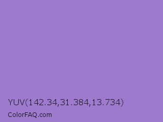 YUV 142.34,31.384,13.734 Color is a light violet color and the nearest color is Lilac Bush #9874d3. Hex code #9e7ace and RGB value is rgb(158,122,206). In RGB color space, this color is composed of 62% red, 48% green, 81% blue, In CMYK color space, this color is composed of 23% cyan, 41% magenta, 0% yellow , 19% black , In HSL color space, this color has a hue angle of 266° , 46% saturation and 64% lightness.