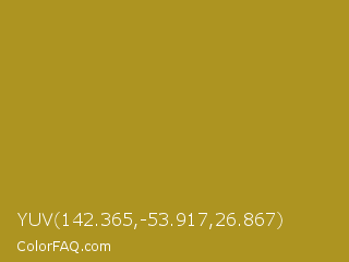 YUV 142.365,-53.917,26.867 Color is a normal yellow color and the nearest color is Lemon Ginger #ac9e22. Hex code #ad9421 and RGB value is rgb(173,148,33). In RGB color space, this color is composed of 68% red, 58% green, 13% blue, In CMYK color space, this color is composed of 0% cyan, 14% magenta, 81% yellow , 32% black , In HSL color space, this color has a hue angle of 49° , 68% saturation and 40% lightness.