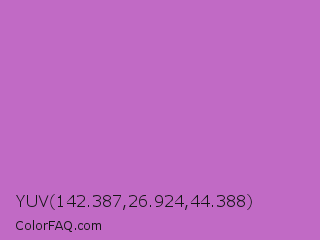 YUV 142.387,26.924,44.388 Color is a normal magenta color and the nearest color is Rich Lilac #b666d2. Hex code #c16ac5 and RGB value is rgb(193,106,197). In RGB color space, this color is composed of 76% red, 42% green, 77% blue, In CMYK color space, this color is composed of 2% cyan, 46% magenta, 0% yellow , 23% black , In HSL color space, this color has a hue angle of 297° , 44% saturation and 59% lightness.