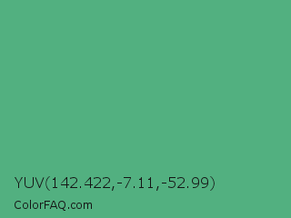 YUV 142.422,-7.11,-52.99 Color is a normal green color and the nearest color is Shiny Shamrock #5fa778. Hex code #52b080 and RGB value is rgb(82,176,128). In RGB color space, this color is composed of 32% red, 69% green, 50% blue, In CMYK color space, this color is composed of 53% cyan, 0% magenta, 27% yellow , 31% black , In HSL color space, this color has a hue angle of 149° , 37% saturation and 51% lightness.