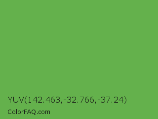 YUV 142.463,-32.766,-37.24 Color is a normal green color and the nearest color is Green RYB #66b032. Hex code #64b14c and RGB value is rgb(100,177,76). In RGB color space, this color is composed of 39% red, 69% green, 30% blue, In CMYK color space, this color is composed of 44% cyan, 0% magenta, 57% yellow , 31% black , In HSL color space, this color has a hue angle of 106° , 40% saturation and 50% lightness.