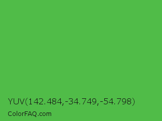 YUV 142.484,-34.749,-54.798 Color is a normal green color and the nearest color is Apple #4fa83d. Hex code #50bc48 and RGB value is rgb(80,188,72). In RGB color space, this color is composed of 31% red, 74% green, 28% blue, In CMYK color space, this color is composed of 57% cyan, 0% magenta, 62% yellow , 26% black , In HSL color space, this color has a hue angle of 116° , 46% saturation and 51% lightness.