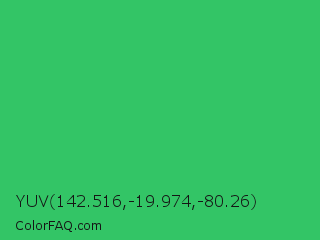 YUV 142.516,-19.974,-80.26 Color is a normal green color and the nearest color is UFO Green #3cd070. Hex code #33c566 and RGB value is rgb(51,197,102). In RGB color space, this color is composed of 20% red, 77% green, 40% blue, In CMYK color space, this color is composed of 74% cyan, 0% magenta, 48% yellow , 23% black , In HSL color space, this color has a hue angle of 141° , 59% saturation and 49% lightness.