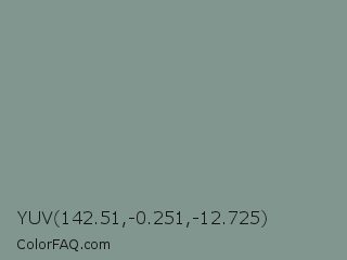 YUV 142.51,-0.251,-12.725 Color is a normal green color and the nearest color is Spanish Green #819885. Hex code #80968e and RGB value is rgb(128,150,142). In RGB color space, this color is composed of 50% red, 59% green, 56% blue, In CMYK color space, this color is composed of 15% cyan, 0% magenta, 5% yellow , 41% black , In HSL color space, this color has a hue angle of 158° , 9% saturation and 55% lightness.