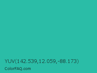 YUV 142.539,12.059,-88.173 Color is a normal cyan color and the nearest color is Light Sea Green #20b2aa. Hex code #2abda7 and RGB value is rgb(42,189,167). In RGB color space, this color is composed of 16% red, 74% green, 65% blue, In CMYK color space, this color is composed of 78% cyan, 0% magenta, 12% yellow , 26% black , In HSL color space, this color has a hue angle of 171° , 64% saturation and 45% lightness.