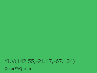 YUV 142.55,-21.47,-67.134 Color is a normal green color and the nearest color is Medium Sea Green #3cb371. Hex code #42be63 and RGB value is rgb(66,190,99). In RGB color space, this color is composed of 26% red, 75% green, 39% blue, In CMYK color space, this color is composed of 65% cyan, 0% magenta, 48% yellow , 25% black , In HSL color space, this color has a hue angle of 136° , 49% saturation and 50% lightness.