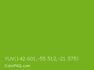 YUV 142.601,-55.512,-21.575 Color is a normal green color and the nearest color is Lima #76bd17. Hex code #76b11e and RGB value is rgb(118,177,30). In RGB color space, this color is composed of 46% red, 69% green, 12% blue, In CMYK color space, this color is composed of 33% cyan, 0% magenta, 83% yellow , 31% black , In HSL color space, this color has a hue angle of 84° , 71% saturation and 41% lightness.