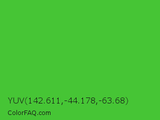 YUV 142.611,-44.178,-63.68 Color is a normal green color and the nearest color is Lime Green #32cd32. Hex code #46c535 and RGB value is rgb(70,197,53). In RGB color space, this color is composed of 27% red, 77% green, 21% blue, In CMYK color space, this color is composed of 64% cyan, 0% magenta, 73% yellow , 23% black , In HSL color space, this color has a hue angle of 113° , 58% saturation and 49% lightness.