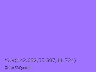 YUV 142.632,55.397,11.724 Color is a light indigo color and the nearest color is Navy Purple #9457eb. Hex code #9c72ff and RGB value is rgb(156,114,255). In RGB color space, this color is composed of 61% red, 45% green, 100% blue, In CMYK color space, this color is composed of 39% cyan, 55% magenta, 0% yellow , 0% black , In HSL color space, this color has a hue angle of 258° , 100% saturation and 72% lightness.