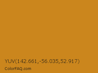 YUV 142.661,-56.035,52.917 Color is a normal orange color and the nearest color is Geebung #d18f1b. Hex code #cb861d and RGB value is rgb(203,134,29). In RGB color space, this color is composed of 80% red, 53% green, 11% blue, In CMYK color space, this color is composed of 0% cyan, 34% magenta, 86% yellow , 20% black , In HSL color space, this color has a hue angle of 36° , 75% saturation and 45% lightness.