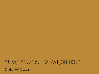YUV 142.716,-42.751,38.837 Color is a normal orange color and the nearest color is Marigold #b98d28. Hex code #bb8938 and RGB value is rgb(187,137,56). In RGB color space, this color is composed of 73% red, 54% green, 22% blue, In CMYK color space, this color is composed of 0% cyan, 27% magenta, 70% yellow , 27% black , In HSL color space, this color has a hue angle of 37° , 54% saturation and 48% lightness.