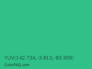 YUV 142.734,-3.813,-83.959 Color is a normal green color and the nearest color is Mountain Meadow #30ba8f. Hex code #2fc187 and RGB value is rgb(47,193,135). In RGB color space, this color is composed of 18% red, 76% green, 53% blue, In CMYK color space, this color is composed of 76% cyan, 0% magenta, 30% yellow , 24% black , In HSL color space, this color has a hue angle of 156° , 61% saturation and 47% lightness.
