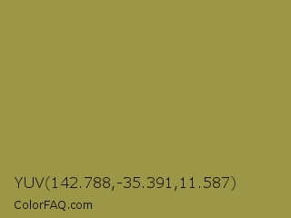YUV 142.788,-35.391,11.587 Color is a normal yellow color and the nearest color is Sycamore #908d39. Hex code #9c9647 and RGB value is rgb(156,150,71). In RGB color space, this color is composed of 61% red, 59% green, 28% blue, In CMYK color space, this color is composed of 0% cyan, 4% magenta, 54% yellow , 39% black , In HSL color space, this color has a hue angle of 56° , 37% saturation and 45% lightness.