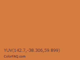 YUV 142.7,-38.306,59.899 Color is a normal orange color and the nearest color is Raw Sienna Crayola #d27d46. Hex code #d37b41 and RGB value is rgb(211,123,65). In RGB color space, this color is composed of 83% red, 48% green, 25% blue, In CMYK color space, this color is composed of 0% cyan, 42% magenta, 69% yellow , 17% black , In HSL color space, this color has a hue angle of 24° , 62% saturation and 54% lightness.