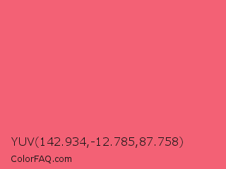YUV 142.934,-12.785,87.758 Color is a light red color and the nearest color is Wild Watermelon #fd5b78. Hex code #f36175 and RGB value is rgb(243,97,117). In RGB color space, this color is composed of 95% red, 38% green, 46% blue, In CMYK color space, this color is composed of 0% cyan, 60% magenta, 52% yellow , 5% black , In HSL color space, this color has a hue angle of 352° , 86% saturation and 67% lightness.