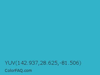 YUV 142.937,28.625,-81.506 Color is a normal cyan color and the nearest color is Maximum Blue Green #30bfbf. Hex code #32b3c9 and RGB value is rgb(50,179,201). In RGB color space, this color is composed of 20% red, 70% green, 79% blue, In CMYK color space, this color is composed of 75% cyan, 11% magenta, 0% yellow , 21% black , In HSL color space, this color has a hue angle of 189° , 60% saturation and 49% lightness.