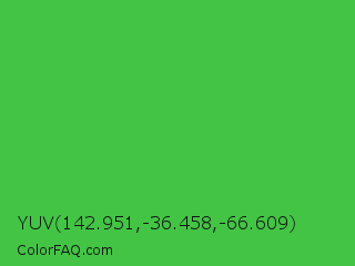 YUV 142.951,-36.458,-66.609 Color is a normal green color and the nearest color is Lime Green #32cd32. Hex code #43c445 and RGB value is rgb(67,196,69). In RGB color space, this color is composed of 26% red, 77% green, 27% blue, In CMYK color space, this color is composed of 66% cyan, 0% magenta, 65% yellow , 23% black , In HSL color space, this color has a hue angle of 121° , 52% saturation and 52% lightness.