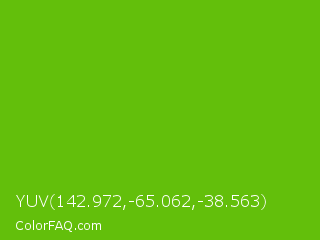 YUV 142.972,-65.062,-38.563 Color is a normal green color and the nearest color is Lima #76bd17. Hex code #63bf0b and RGB value is rgb(99,191,11). In RGB color space, this color is composed of 39% red, 75% green, 4% blue, In CMYK color space, this color is composed of 48% cyan, 0% magenta, 94% yellow , 25% black , In HSL color space, this color has a hue angle of 91° , 89% saturation and 40% lightness.
