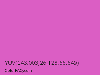 YUV 143.003,26.128,66.649 Color is a light magenta color and the nearest color is Orchid #da70d6. Hex code #db5ec4 and RGB value is rgb(219,94,196). In RGB color space, this color is composed of 86% red, 37% green, 77% blue, In CMYK color space, this color is composed of 0% cyan, 57% magenta, 11% yellow , 14% black , In HSL color space, this color has a hue angle of 311° , 63% saturation and 61% lightness.
