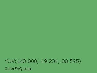 YUV 143.008,-19.231,-38.595 Color is a normal green color and the nearest color is Fern #63b76c. Hex code #63ad68 and RGB value is rgb(99,173,104). In RGB color space, this color is composed of 39% red, 68% green, 41% blue, In CMYK color space, this color is composed of 43% cyan, 0% magenta, 40% yellow , 32% black , In HSL color space, this color has a hue angle of 124° , 31% saturation and 53% lightness.