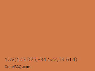 YUV 143.025,-34.522,59.614 Color is a normal orange color and the nearest color is Raw Sienna Crayola #d27d46. Hex code #d37a49 and RGB value is rgb(211,122,73). In RGB color space, this color is composed of 83% red, 48% green, 29% blue, In CMYK color space, this color is composed of 0% cyan, 42% magenta, 65% yellow , 17% black , In HSL color space, this color has a hue angle of 21° , 61% saturation and 56% lightness.