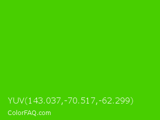 YUV 143.037,-70.517,-62.299 Color is a normal green color and the nearest color is Harlequin Green #46cb18. Hex code #48cf00 and RGB value is rgb(72,207,-0). In RGB color space, this color is composed of 28% red, 81% green, 0% blue, In CMYK color space, this color is composed of 65% cyan, 0% magenta, 100% yellow , 19% black , In HSL color space, this color has a hue angle of 99° , 100% saturation and 41% lightness.