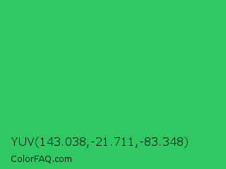 YUV 143.038,-21.711,-83.348 Color is a normal green color and the nearest color is UFO Green #3cd070. Hex code #30c863 and RGB value is rgb(48,200,99). In RGB color space, this color is composed of 19% red, 78% green, 39% blue, In CMYK color space, this color is composed of 76% cyan, 0% magenta, 51% yellow , 22% black , In HSL color space, this color has a hue angle of 140° , 61% saturation and 49% lightness.