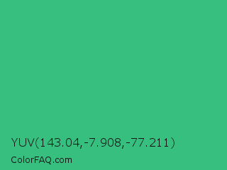 YUV 143.04,-7.908,-77.211 Color is a normal green color and the nearest color is Mint #3eb489. Hex code #37bf7f and RGB value is rgb(55,191,127). In RGB color space, this color is composed of 22% red, 75% green, 50% blue, In CMYK color space, this color is composed of 71% cyan, 0% magenta, 34% yellow , 25% black , In HSL color space, this color has a hue angle of 152° , 55% saturation and 48% lightness.