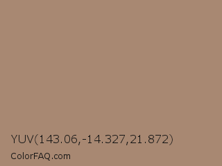 YUV 143.06,-14.327,21.872 Color is a normal orange color and the nearest color is Sandal #aa8d6f. Hex code #a88872 and RGB value is rgb(168,136,114). In RGB color space, this color is composed of 66% red, 53% green, 45% blue, In CMYK color space, this color is composed of 0% cyan, 19% magenta, 32% yellow , 34% black , In HSL color space, this color has a hue angle of 24° , 24% saturation and 55% lightness.
