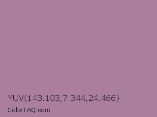 YUV 143.103,7.344,24.466 Color is a normal magenta color and the nearest color is Bouquet #ae809e. Hex code #ab7e9e and RGB value is rgb(171,126,158). In RGB color space, this color is composed of 67% red, 49% green, 62% blue, In CMYK color space, this color is composed of 0% cyan, 26% magenta, 8% yellow , 33% black , In HSL color space, this color has a hue angle of 317° , 21% saturation and 58% lightness.