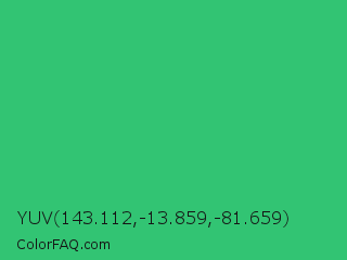 YUV 143.112,-13.859,-81.659 Color is a normal green color and the nearest color is UFO Green #3cd070. Hex code #32c473 and RGB value is rgb(50,196,115). In RGB color space, this color is composed of 20% red, 77% green, 45% blue, In CMYK color space, this color is composed of 74% cyan, 0% magenta, 41% yellow , 23% black , In HSL color space, this color has a hue angle of 147° , 59% saturation and 48% lightness.