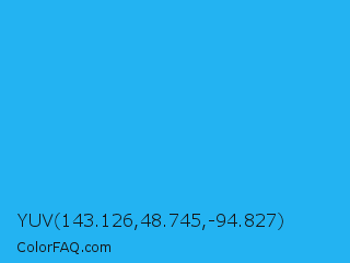 YUV 143.126,48.745,-94.827 Color is a normal blue color and the nearest color is Button Blue #24a0ed. Hex code #23b3f2 and RGB value is rgb(35,179,242). In RGB color space, this color is composed of 14% red, 70% green, 95% blue, In CMYK color space, this color is composed of 86% cyan, 26% magenta, 0% yellow , 5% black , In HSL color space, this color has a hue angle of 198° , 89% saturation and 54% lightness.