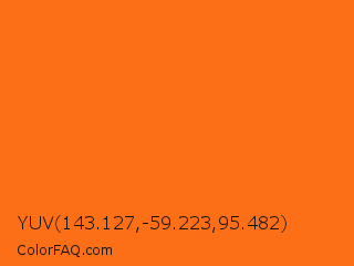YUV 143.127,-59.223,95.482 Color is a normal orange color and the nearest color is Pumpkin #ff7518. Hex code #fc6f17 and RGB value is rgb(252,111,23). In RGB color space, this color is composed of 99% red, 44% green, 9% blue, In CMYK color space, this color is composed of 0% cyan, 56% magenta, 91% yellow , 1% black , In HSL color space, this color has a hue angle of 23° , 97% saturation and 54% lightness.
