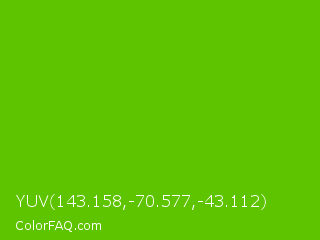 YUV 143.158,-70.577,-43.112 Color is a normal green color and the nearest color is Kelly Green #4cbb17. Hex code #5ec400 and RGB value is rgb(94,196,-0). In RGB color space, this color is composed of 37% red, 77% green, 0% blue, In CMYK color space, this color is composed of 52% cyan, 0% magenta, 100% yellow , 23% black , In HSL color space, this color has a hue angle of 91° , 100% saturation and 38% lightness.