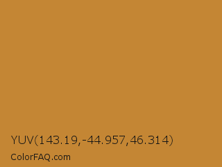 YUV 143.19,-44.957,46.314 Color is a normal orange color and the nearest color is Bronze #cd7f32. Hex code #c48634 and RGB value is rgb(196,134,52). In RGB color space, this color is composed of 77% red, 53% green, 20% blue, In CMYK color space, this color is composed of 0% cyan, 32% magenta, 73% yellow , 23% black , In HSL color space, this color has a hue angle of 34° , 58% saturation and 49% lightness.