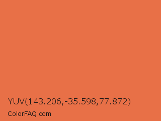 YUV 143.206,-35.598,77.872 Color is a normal color and the nearest color is Burnt Sienna #e97451. Hex code #e87047 and RGB value is rgb(232,112,71). In RGB color space, this color is composed of 91% red, 44% green, 28% blue, In CMYK color space, this color is composed of 0% cyan, 52% magenta, 69% yellow , 9% black , In HSL color space, this color has a hue angle of 15° , 78% saturation and 59% lightness.