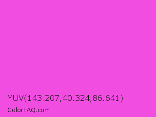 YUV 143.207,40.324,86.641 Color is a light magenta color and the nearest color is Purple Pizzazz #fe4eda. Hex code #f24de1 and RGB value is rgb(242,77,225). In RGB color space, this color is composed of 95% red, 30% green, 88% blue, In CMYK color space, this color is composed of 0% cyan, 68% magenta, 7% yellow , 5% black , In HSL color space, this color has a hue angle of 306° , 86% saturation and 63% lightness.