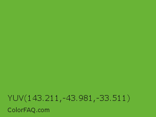YUV 143.211,-43.981,-33.511 Color is a normal green color and the nearest color is Green RYB #66b032. Hex code #69b436 and RGB value is rgb(105,180,54). In RGB color space, this color is composed of 41% red, 71% green, 21% blue, In CMYK color space, this color is composed of 42% cyan, 0% magenta, 70% yellow , 29% black , In HSL color space, this color has a hue angle of 96° , 54% saturation and 46% lightness.