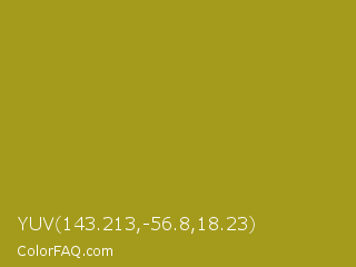 YUV 143.213,-56.8,18.23 Color is a normal yellow color and the nearest color is Lemon Ginger #ac9e22. Hex code #a49b1c and RGB value is rgb(164,155,28). In RGB color space, this color is composed of 64% red, 61% green, 11% blue, In CMYK color space, this color is composed of 0% cyan, 5% magenta, 83% yellow , 36% black , In HSL color space, this color has a hue angle of 56° , 71% saturation and 38% lightness.