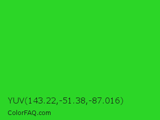 YUV 143.22,-51.38,-87.016 Color is a normal green color and the nearest color is Lime Green #32cd32. Hex code #2cd627 and RGB value is rgb(44,214,39). In RGB color space, this color is composed of 17% red, 84% green, 15% blue, In CMYK color space, this color is composed of 79% cyan, 0% magenta, 82% yellow , 16% black , In HSL color space, this color has a hue angle of 118° , 69% saturation and 50% lightness.