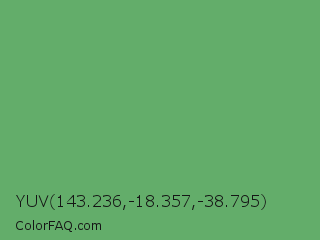 YUV 143.236,-18.357,-38.795 Color is a normal green color and the nearest color is Fern #63b76c. Hex code #63ad6a and RGB value is rgb(99,173,106). In RGB color space, this color is composed of 39% red, 68% green, 42% blue, In CMYK color space, this color is composed of 43% cyan, 0% magenta, 39% yellow , 32% black , In HSL color space, this color has a hue angle of 126° , 31% saturation and 53% lightness.