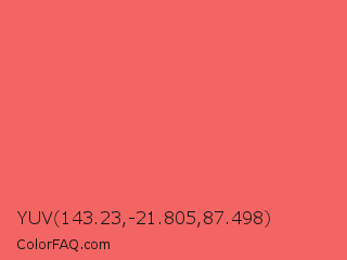 YUV 143.23,-21.805,87.498 Color is a light red color and the nearest color is Carnation #f95a61. Hex code #f36563 and RGB value is rgb(243,101,99). In RGB color space, this color is composed of 95% red, 40% green, 39% blue, In CMYK color space, this color is composed of 0% cyan, 58% magenta, 59% yellow , 5% black , In HSL color space, this color has a hue angle of 1° , 86% saturation and 67% lightness.